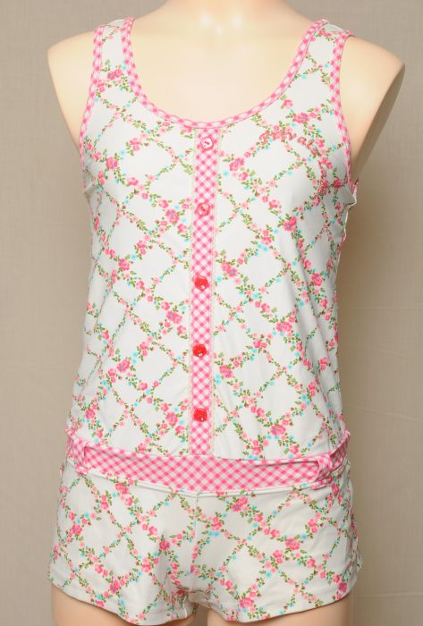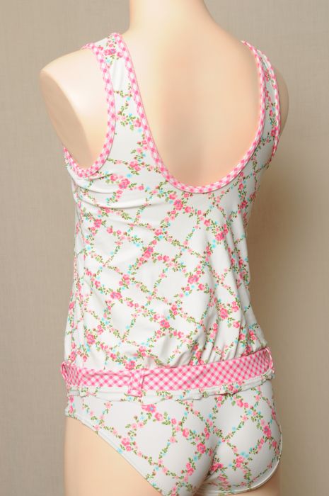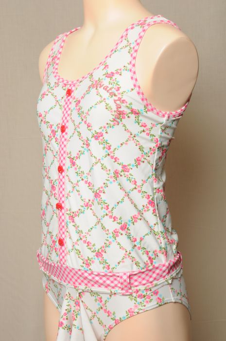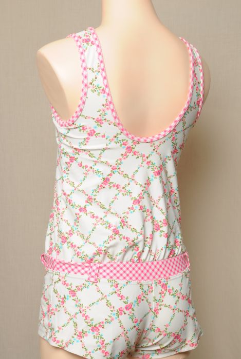タンクトップとショートパンツのいわゆる”2ピース水着”にも見えますが、実際は上下が繋がっています。
