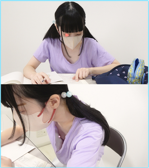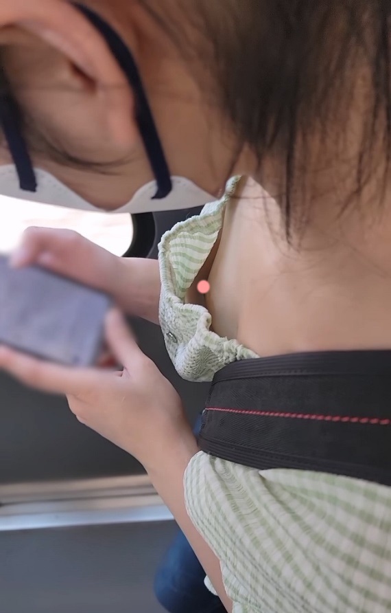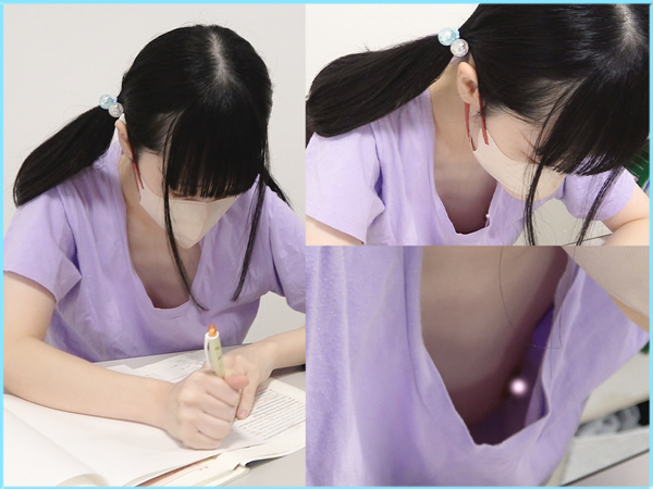 例えば、電車の入口側に座っているところを上か見下ろしたり、前かがみになっているところを正面から。